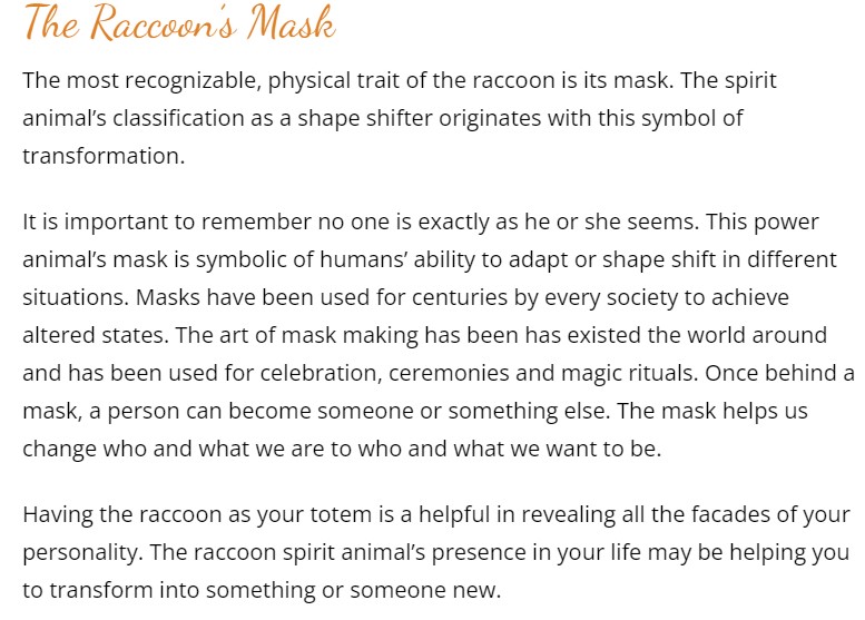 The mask of the raccoon was so prominent to me, it was the first thing I could see and the animal sort of appeared around the mask with the goat appearing under him. I found this explanation below fascinating! If you have ever seen anyone shape-shift then you also realise that there is some magic that many of us have no understanding of.
