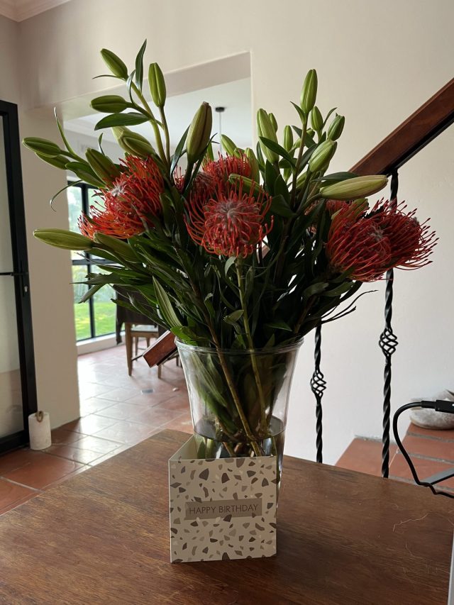 In case you did not guess from my obscure blog title, my 64th birthday was this Wednesday the 3rd. I woke to lots of messages and after I showered and went downstairs, Norm had left two big beautiful bouquets of flowers, both red pincushion proteas as well as lilies. He also left a lovely card for me.