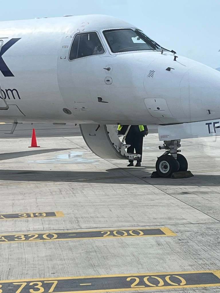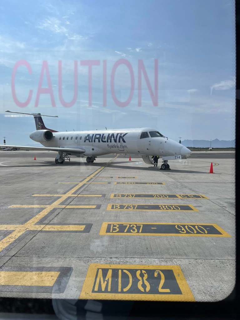 Depending on the day and time, the flights to George are sometimes via a teeny, tiny plane. In the photo it looks reasonable until you count the windows and realise that is more than the number of rows. They have you queue at the gate shown above, then you board a bus. The bus then takes you out onto the tarmac where you are herded onto the plane.