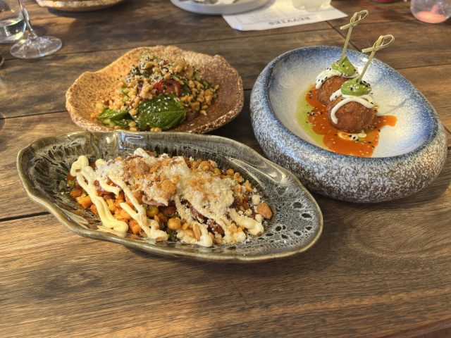 I took a pic of my dishes: from the upper left – the dirty steak, the pulled pork lollipops, and the Mexican Street Corn is at the bottom.