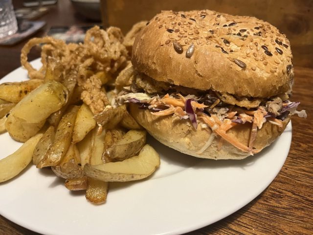 Those onion rings were the star for me, so divine and crunchy and light. The bun on the sandwich was cold and tough to bite, maybe the bun was not fresh or just that it was kept in the fridge? The pulled pork was delicious. I took the top off of the bun and ate the insides of the sandwich. I would have preferred just the pork and slaw myself. Saying all of this – we will definitely go back again.