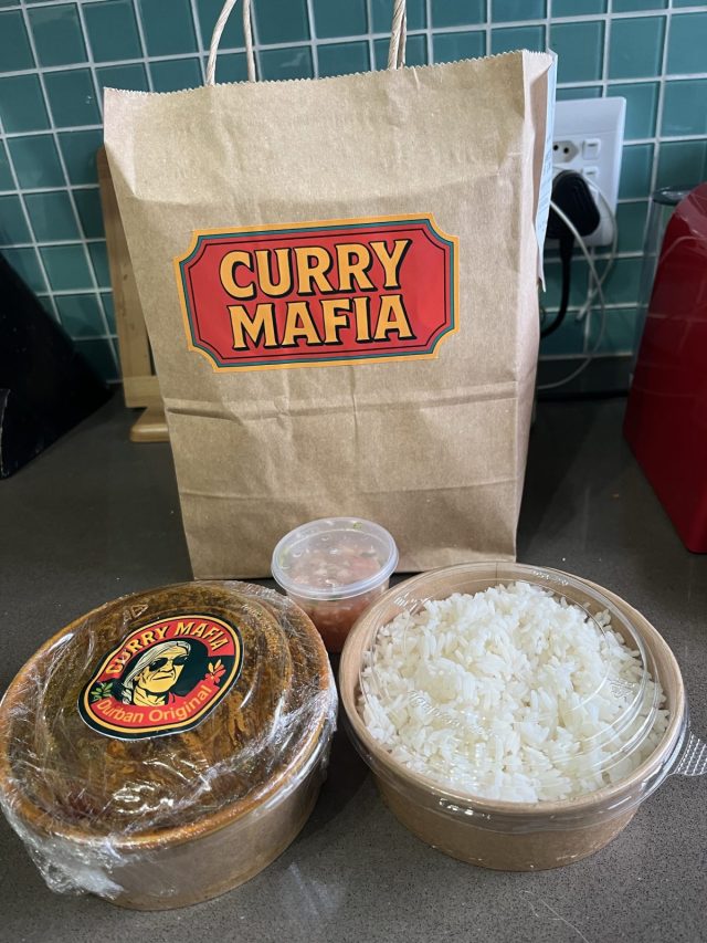 I ordered the ‘Trigger Chick’ and their website menu description is: “This one pulls no punches. Chicken, slow-simmered in a deep, red Durban curry sauce laced with roasted spices, garlic, and that signature kick. It’s bold, it’s loyal, it’s a Curry Mafia classic.”