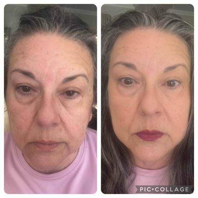 I ordered it online and on Sunday I decided to give it a try. You rub it until the colour develops, then apply it sparingly. It is expensive but a little goes a long way. My later applications I have added a second layer to my under eye area. These were taken in the same lighting – left pic is completely bare faced and the right is after waiting for the colour to ‘settle’. I am so impressed with the coverage with no heavy feeling on your skin. It is also ‘sweat proof’.