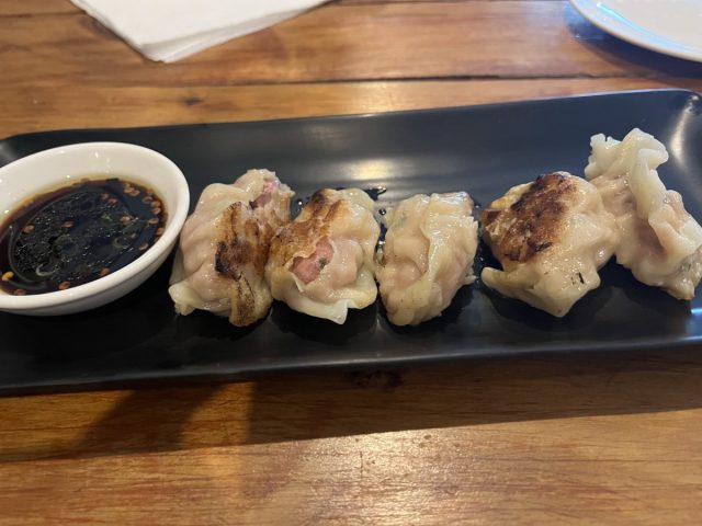 We ordered the Gyoza pan fried dumplings: pork and prawn filled little balls of heaven.
