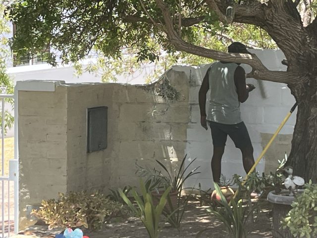 Kim came to work on Wednesday and he started painting the inside of the perimeter wall. The painters did the street side of the wall when we had the house painted.