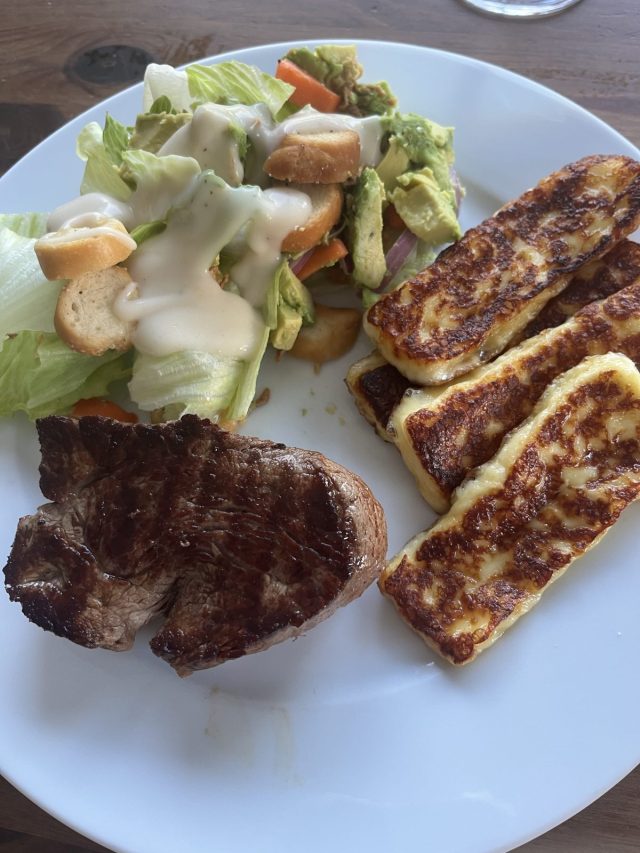 On Sunday once it cooled down Norman cooked dinner for us. He made one of our favourite summer combos: fillet steak and fried halloumi. I made a salad to go with it.