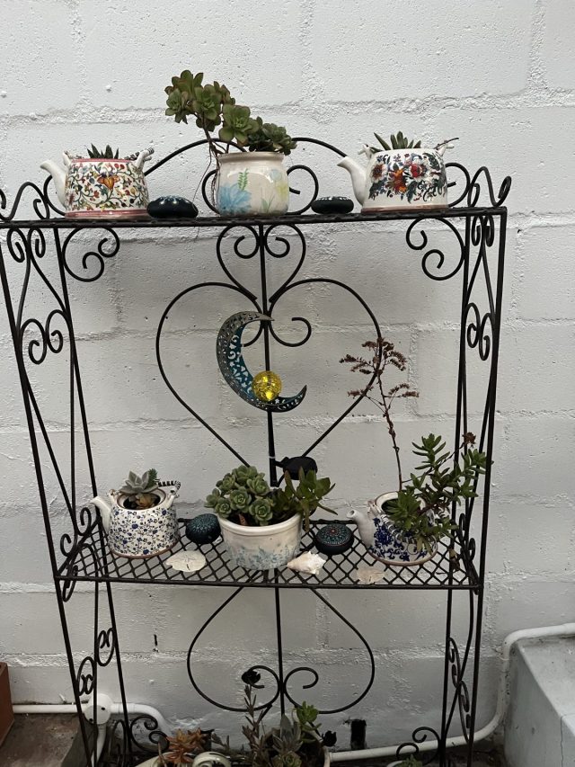 I had been fretting over where best to put my solar light from the kids. I had it in a big succulent pot but you could not see the beauty of the light. So I used some zip ties and secured it to this metal stand. This pic was taken just as the sun was going down and the light was fading.