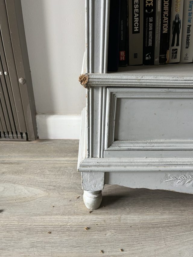But Miss Poppy is in bigggg trouble. I discovered that she has been chewing on the bookcase on our landing. It is not wood, it is particle board but I love this sweet little bookcase, and now it looks bedraggled. Maybe we can file it down and touch it up with paint to make it less obvious?