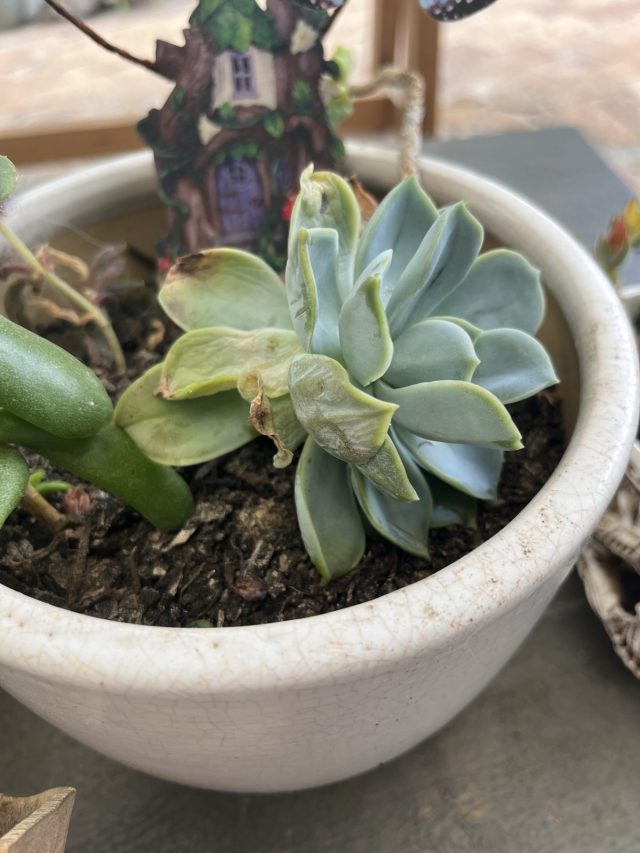 This week I also discovered some little white sticky spots on a plant. When I looked at the bottom of the plant I saw lots of little white critters with many legs. Most likely mealybugs or aphids. I used my tiny plant tools to swab the areas with alcohol and clean off everything I could see.