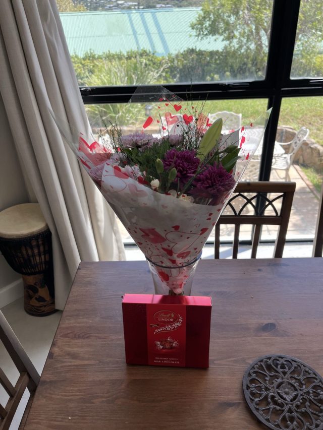 When I woke this morning he had a bouquet of flowers and some chocolates on my desk for me.