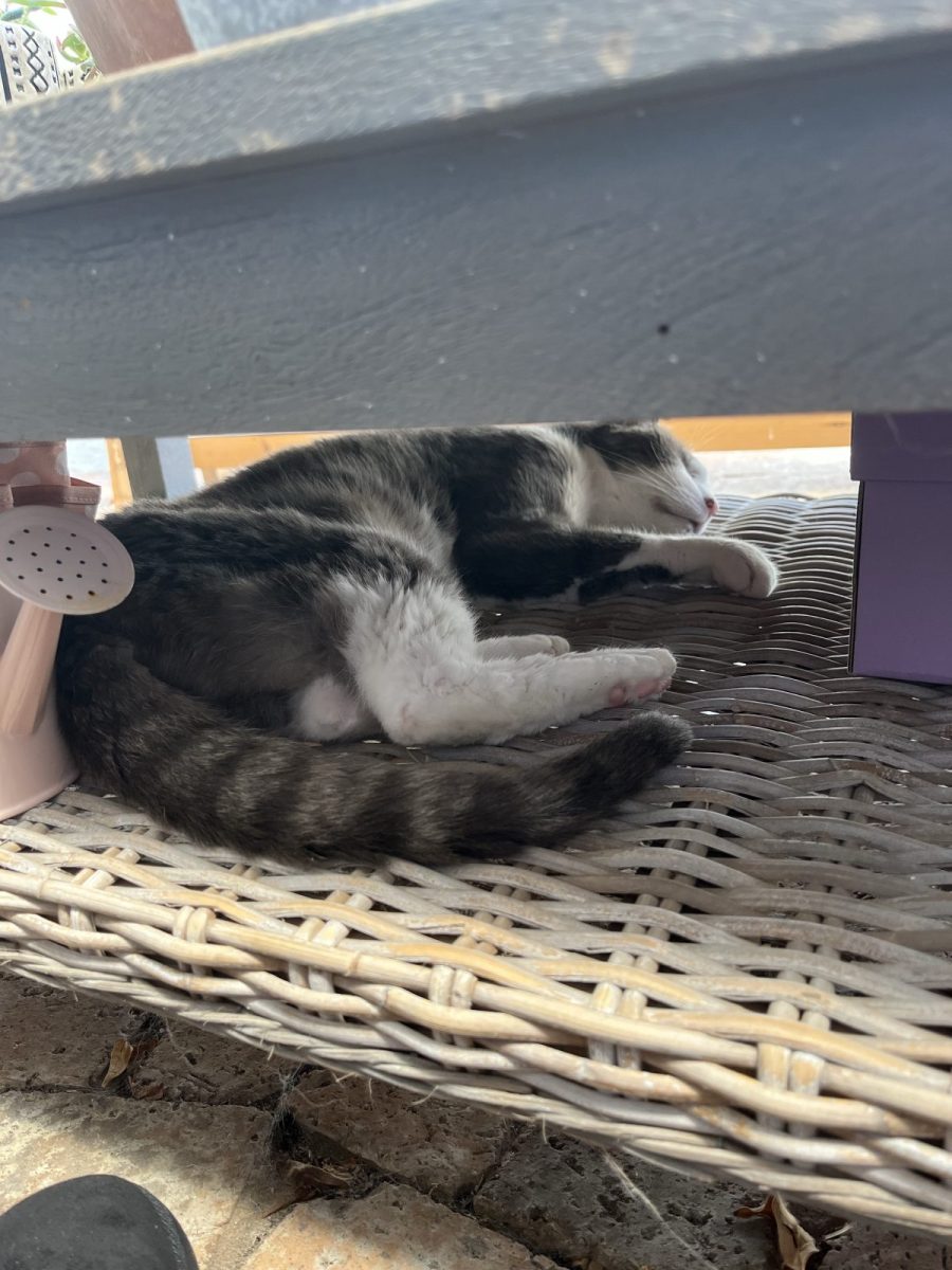 Blue has been sleeping on the shelf under the outside patio table. I think it gets air from the wicker beneath him and it is protected from the annoying dogs.