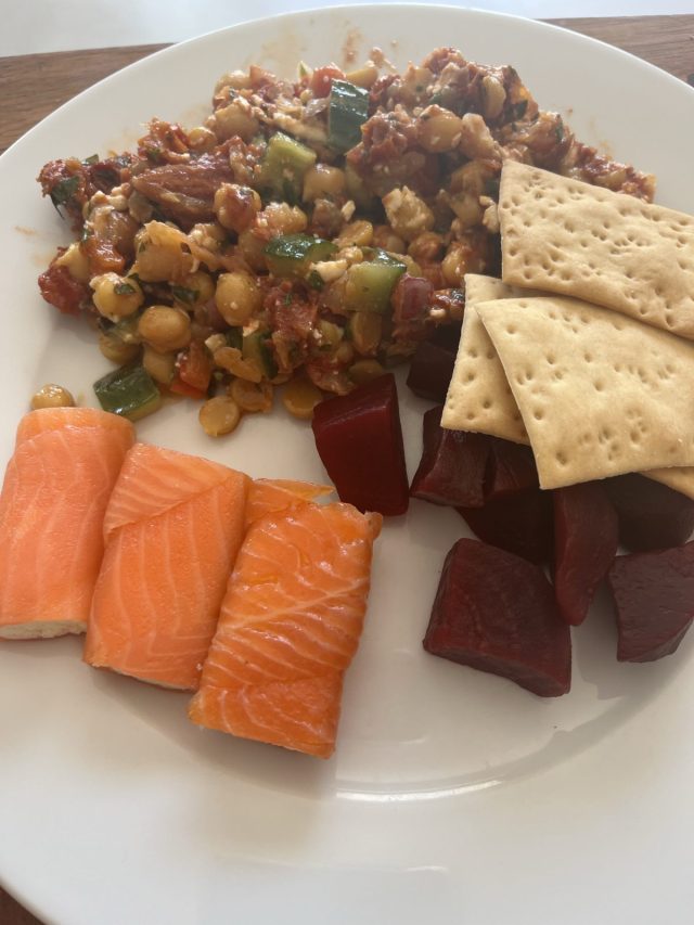 In addition to the chili ingredients I also ordered some healthy prepared food and salads and veggies so that I had access to easily available food while Norm was away. If left to my own devices I will live on cookies and iced coffees. It was so hot on Tuesday that I had to force myself to eat, but once I did my meal was very tasty. My menu consisted of what had that date as an expiration date. I had a pre-prepared chickpea, cucumber, feta, sundried tomato, and tapenade salad, salmon & cream cheese rolls, a few spoons of beet root and flat bread crackers.