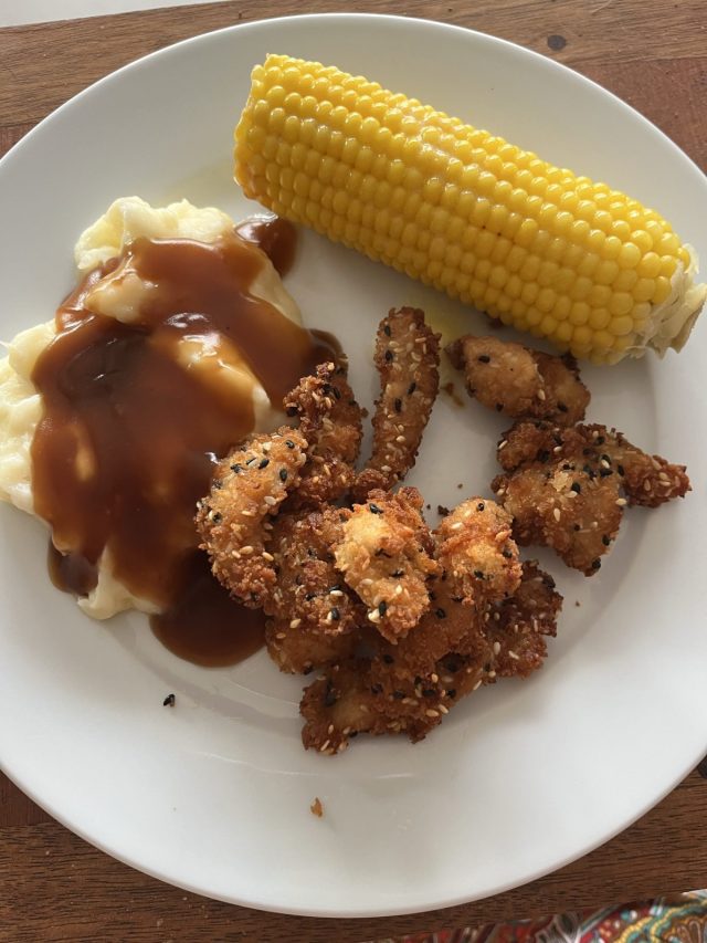 I cooked for myself, even though it was so hot, I still had to eat and I did not want to waste any shopping from it going out of date. I put sesame chicken strips in the air fryer, heated some prepared mash, made instant gravy and boiled an ear of corn. I boiled all 4 ears from the packet and then put the other 3 in the fridge to cut off the niblets to add to salads.