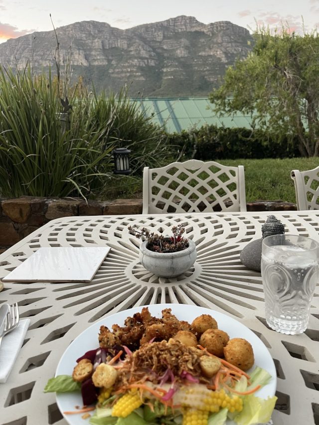 Thursday night I finished off the rest of the chicken strips, air fried some potato croquettes, added some beetroot and made a big fresh salad, including my corn niblets. As it was a bit cooler I sat outside to eat.