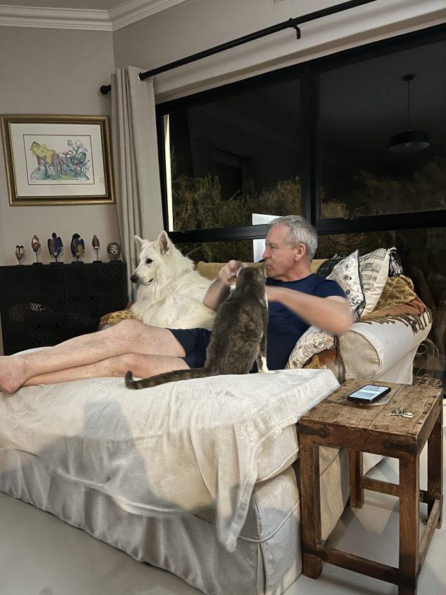 All of the animals were so happy Norm was home. That night they all insisted on having special cuddles while he was trying to have a wee glass of wine and a rest.