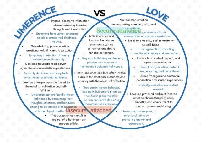 Last week I mentioned ‘limerence’ and for those of you who do not understand the difference between limerence and love, this is a very good diagram showing how they differ and how they cross over. Everyone knows my love of the Venn! As I discussed in my last blog, I was obsessed with that man in that relationship. It was at a really traumatic period of my life and I think I was using him as an alternative to focusing on what was really going on in my life. If I focused too hard on that painful thing that was happening it would have broken me and I could not have gone on. Our brains know what we can handle and what we cannot and they often throw in diversions to save us from that pain.