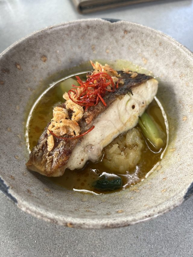 Norm’s two dishes arrived at the same time as well. He started with the Pork Belly Kimchi Jiggae with white cabbage, sesame and radish. It was R245 (approx. $15 USD). I did not like the look of this, it was much too fatty for me. Norm raved about this dish, it was his #1 of the day.