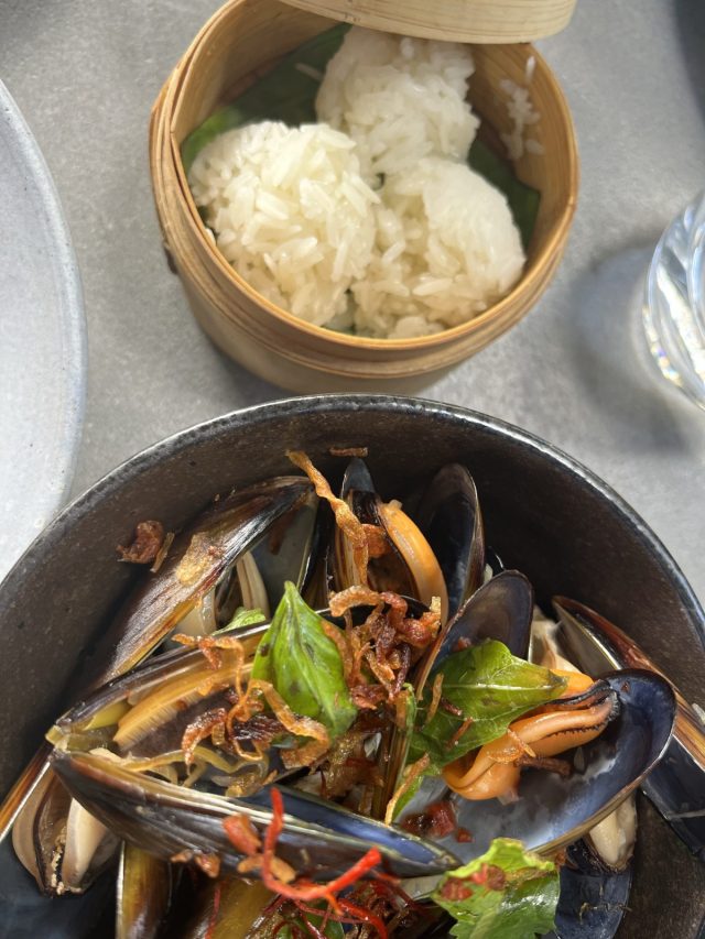 My third dish was the West Coast Mussels in a nahm prik pla dressing. It was R225 (approx. $13.25 USD). It was served with sticky rice which came in a cute little steamer, but I did not eat the rice. As mentioned the mussels came at the same time as the prawns. They were cold, not sure if that was from waiting in the kitchen or waiting while I ate my prawns.