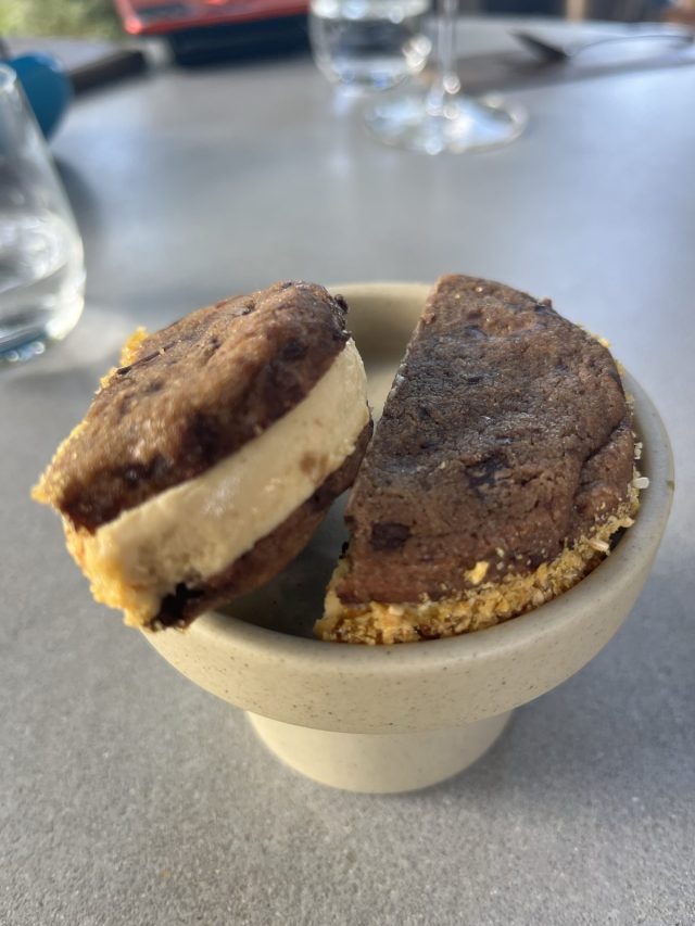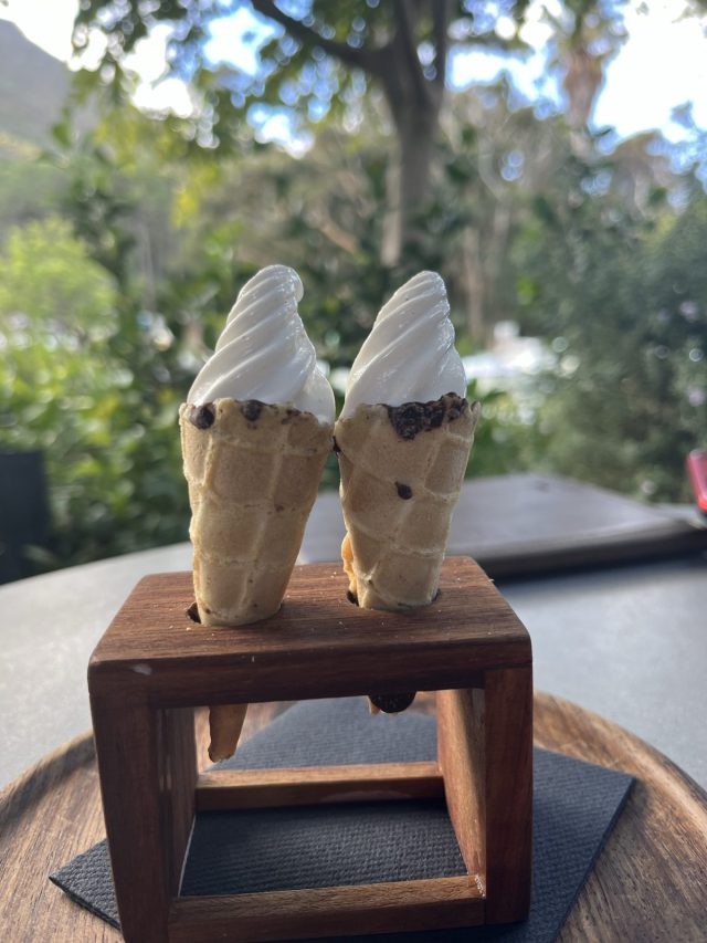 We both felt we could still manage dessert and ordered 2 of their ice cream sandwiches but Mike, our waiter, told us one is enough for us as it is ‘in two pieces’. It was described as ice cream sandwich with 68% dark Nyangbo chocolate from Ghana, sesame parfait, blood orange marmalade. It was R165 (approx. $10 USD). I did not like the taste of this at all and was thankful to Mike we had not ordered two of them. I do not like dark chocolate or orange and it was intensely both. Norm loved it so it did not go to waste.
