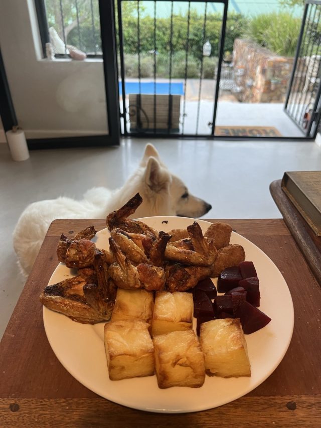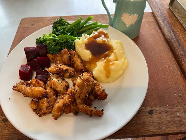 That evening I did not want to put the oven on because it was just too hot. I had sesame chicken strips for the air fryer, I had prepared mash for the microwave, I had baby broccoli which I also microwaved, the gravy was instant so I used the kettle and my cute little pitcher. The beetroot was prepared and just needed a spoon. As they say – fed is best and Sweat is Blech. (I made up the last part).