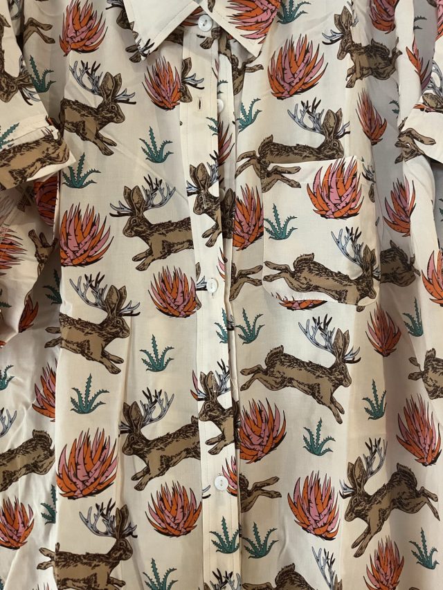 I had a delivery of some clothes I had bought in the sales. One dress still had the security tag on it so I will have to go into the shop which annoys me. One of the dresses was so sheer that you could see straight through it. Both will need to go to Truworths. But from a different site I ordered this shirt which arrived the same day and the happiness it elicits covers all the pain induced by Truworths. Norm called the animals reindeer but I told him they are jackalopes of course! It is lightweight and should be cool to wear.